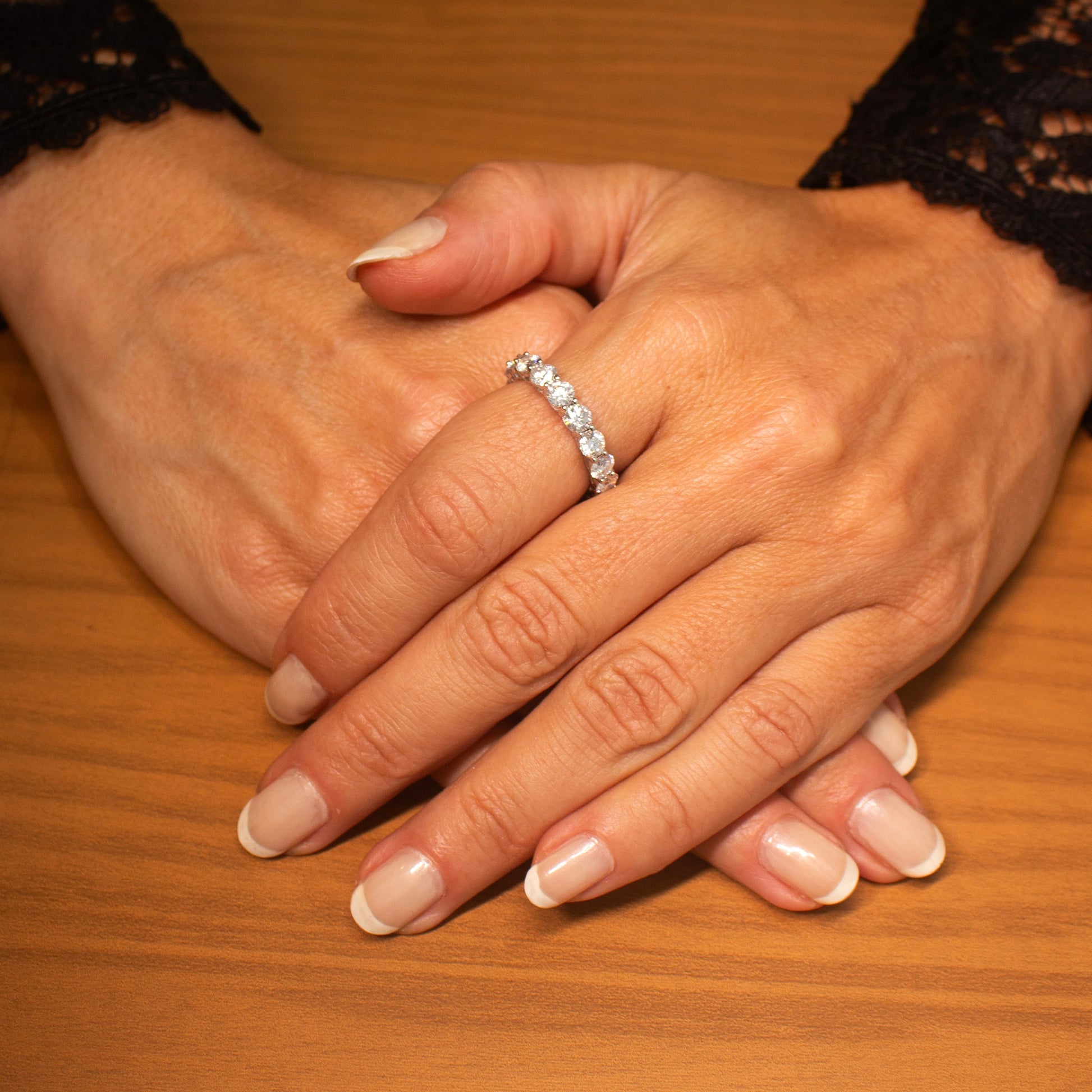 - Design: A aliança apresenta um design contínuo, onde moissanites de 30 pontos cada são dispostas uniformemente ao longo do aro. Este estilo permite um brilho constante e cintilante de todas as direções.