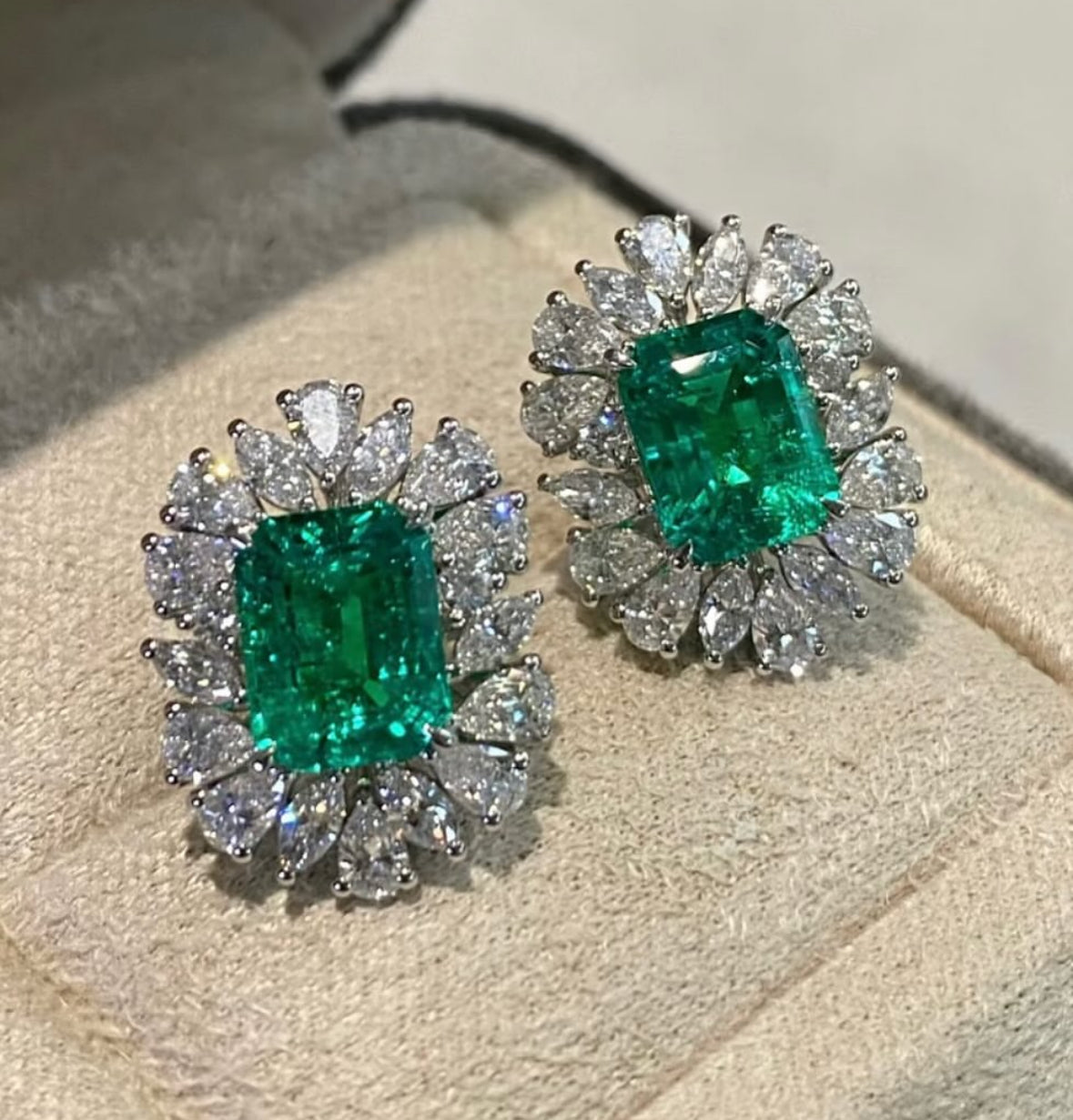 Brinco de esmeralda de laboratório colombiana, lapidação Emerald Cut 5 quilates cada pedra, com gotas e navetes de 20 pontos cada