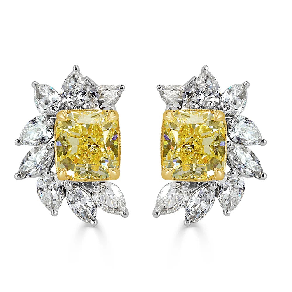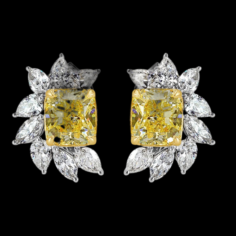Brinco de fancy yellow moissanite de 5 quilates emerando cut envolto em moissanites na lapidações navete de 50 pontos cada em prata 925 com banho de ouro 18k