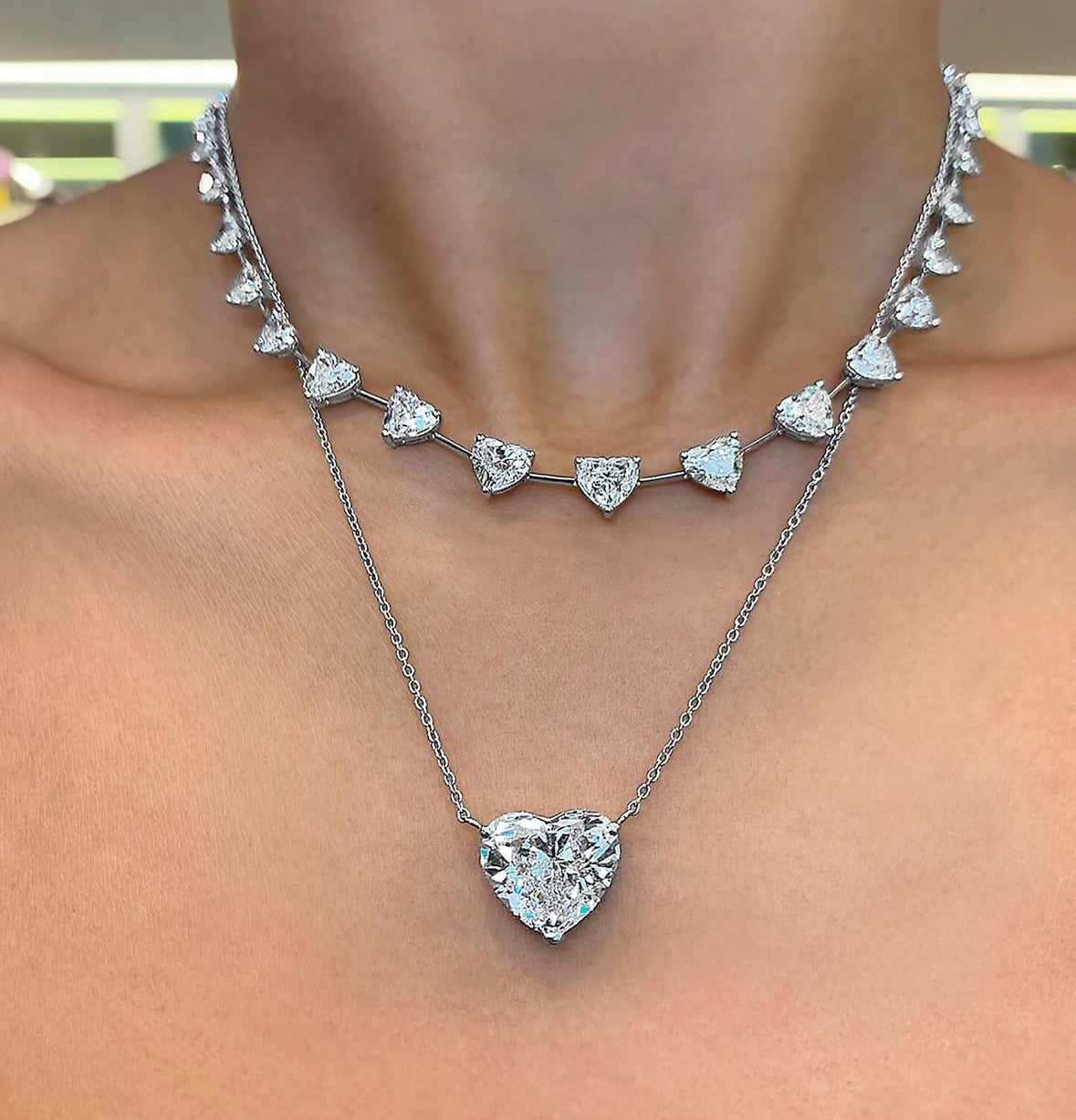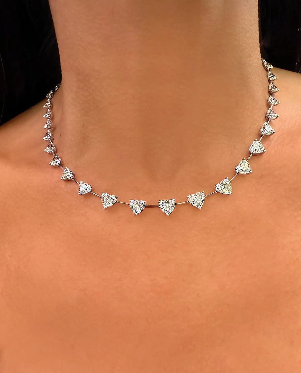 Com 2 quilates cada, os corações são grandes o suficiente para serem notados, mas não tão grandes que sejam ostentosos. O colar todo é uma obra de arte em ouro branco e pedras preciosas, que certamente vai chamar a atenção e inspirar admiração.