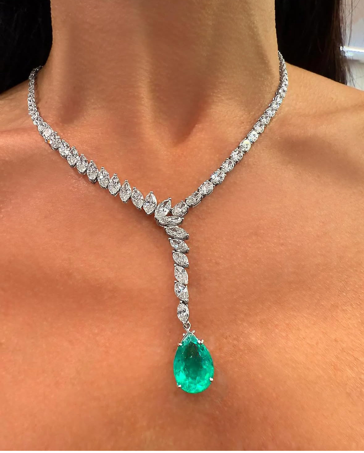 No centro do colar, abaixo dos diamantes moissanite, está uma gota de esmeralda de laboratório de 10 quilates. A esmeralda é uma pedra preciosa verde intensa e vibrante que adiciona um toque de cor e luxo ao design. A forma de gota é clássica e elegante, e o tamanho de 10 quilates é impressionante.