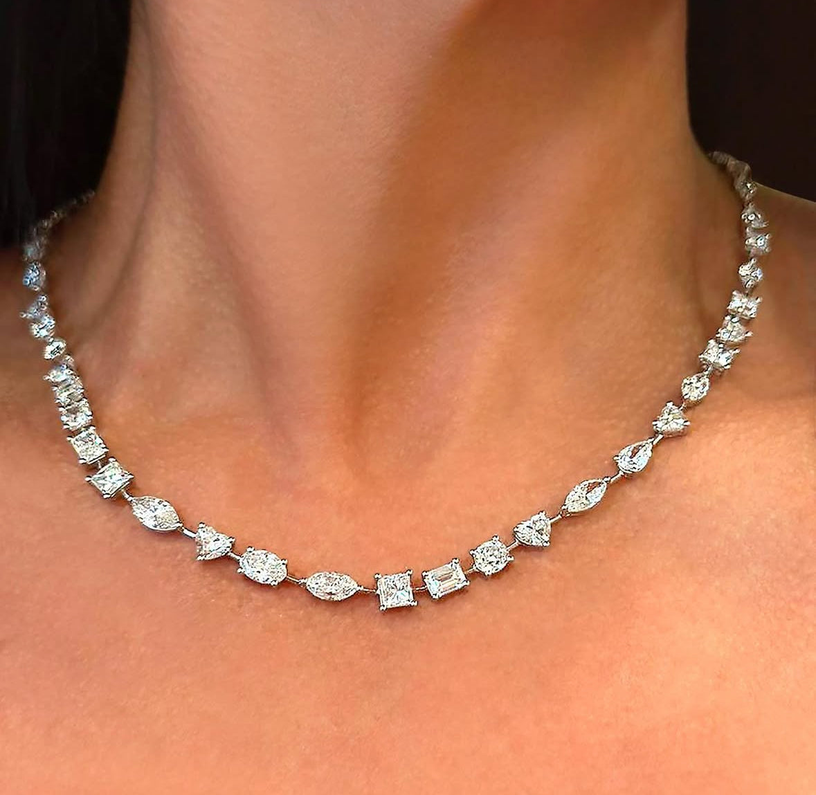 No geral, esse riviera é uma peça única e impressionante que certamente vai chamar a atenção. A combinação de diferentes lapidações e o uso de pedras de moissanite criam um efeito visual incrível, enquanto o ouro branco 18k adiciona um toque de luxo e sofisticação.