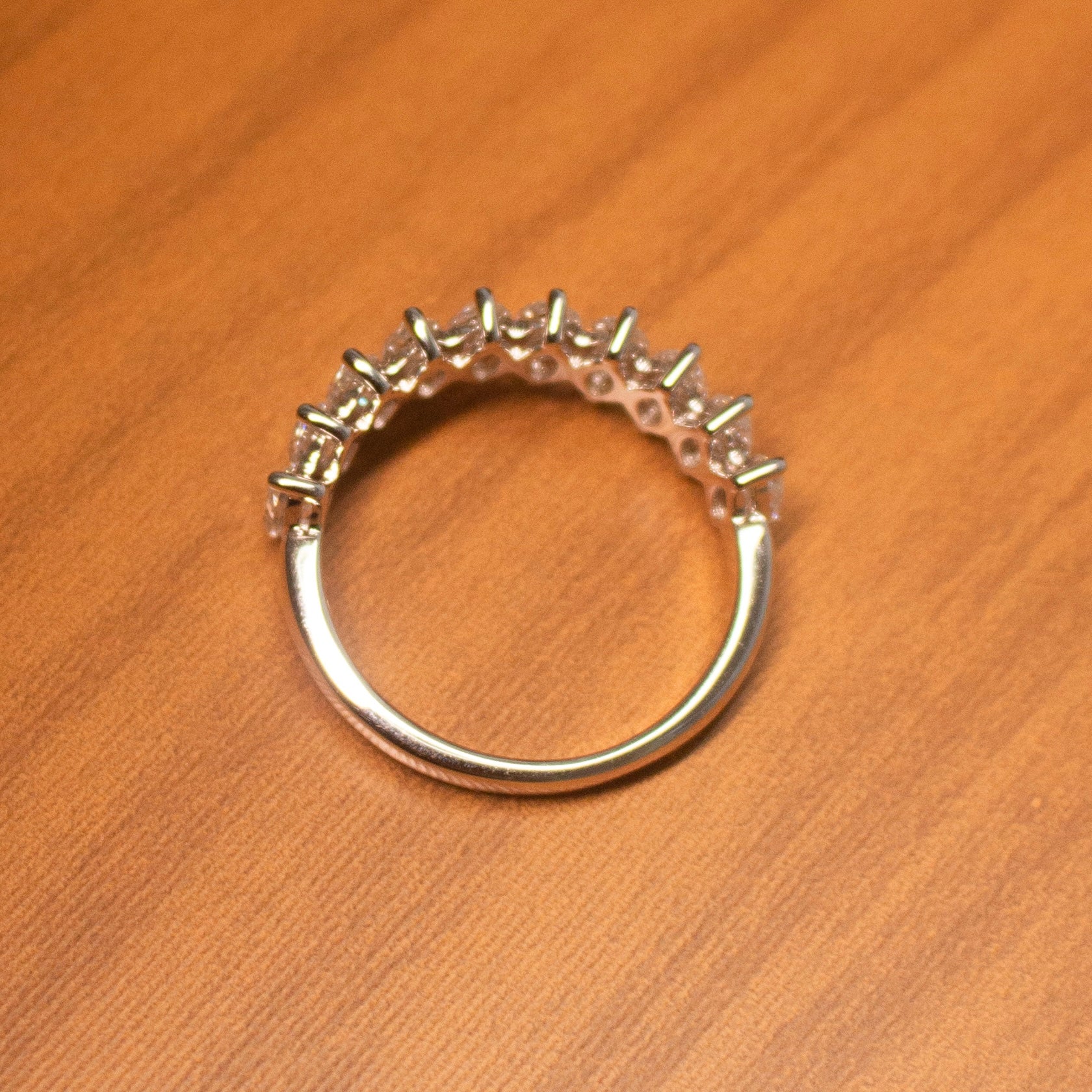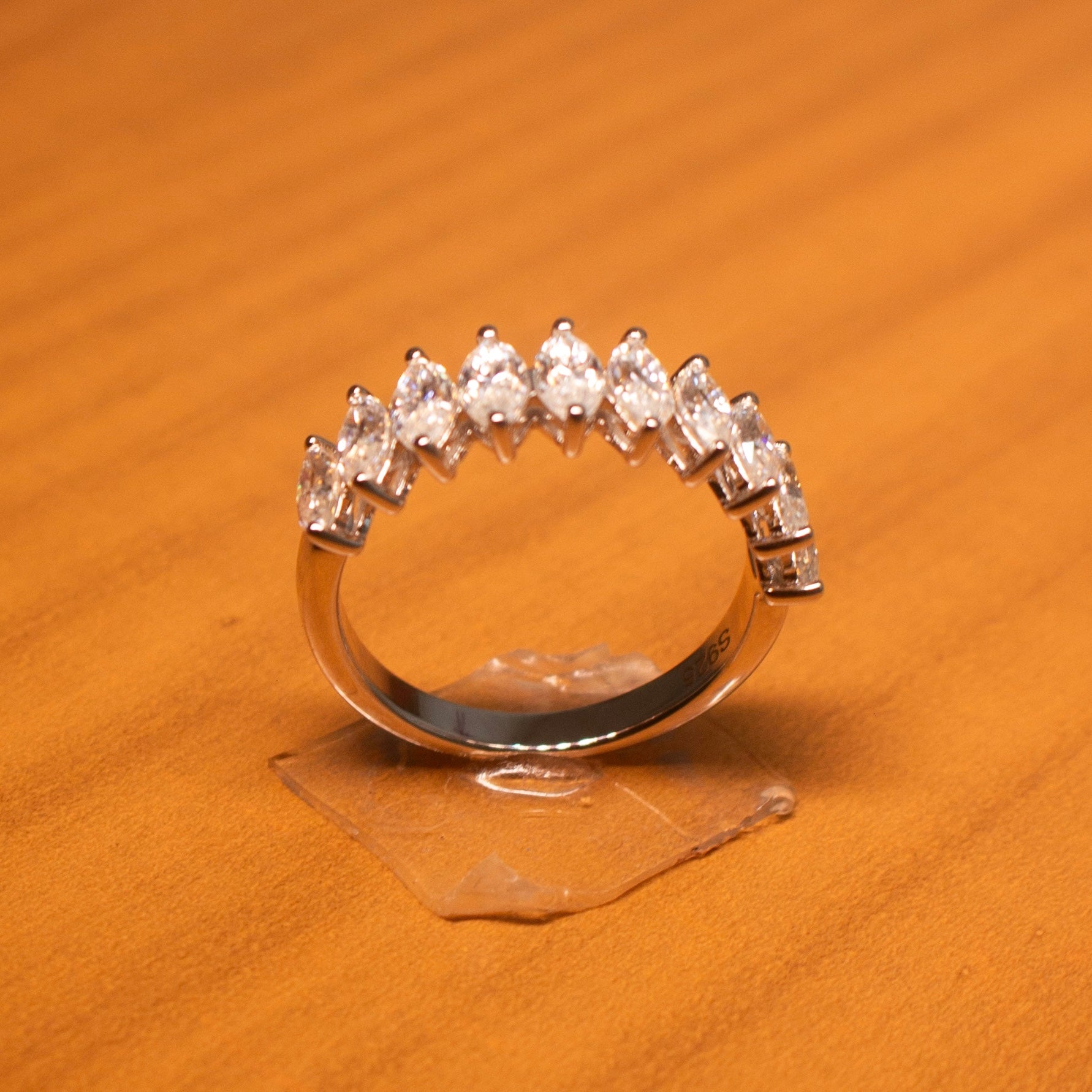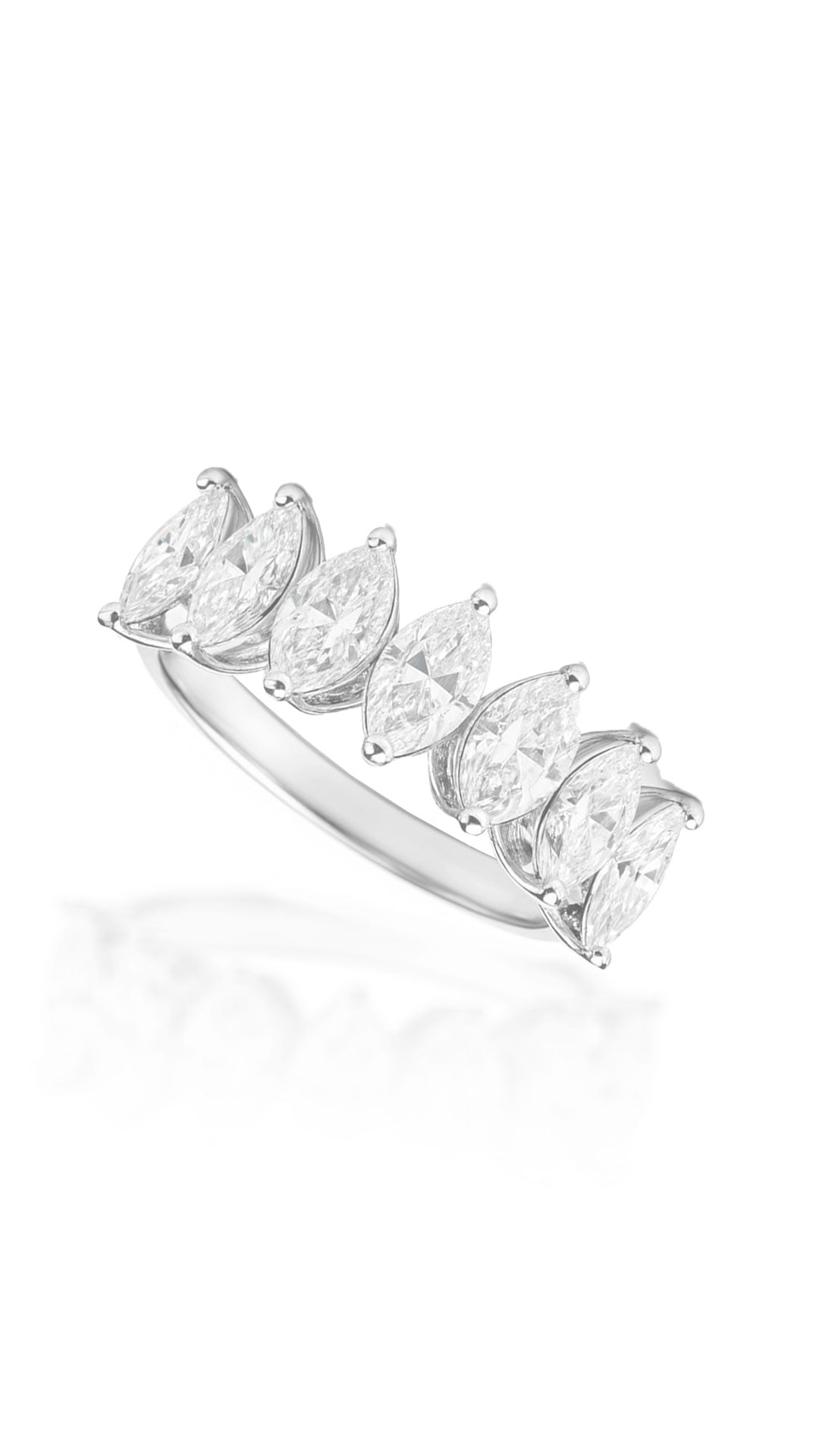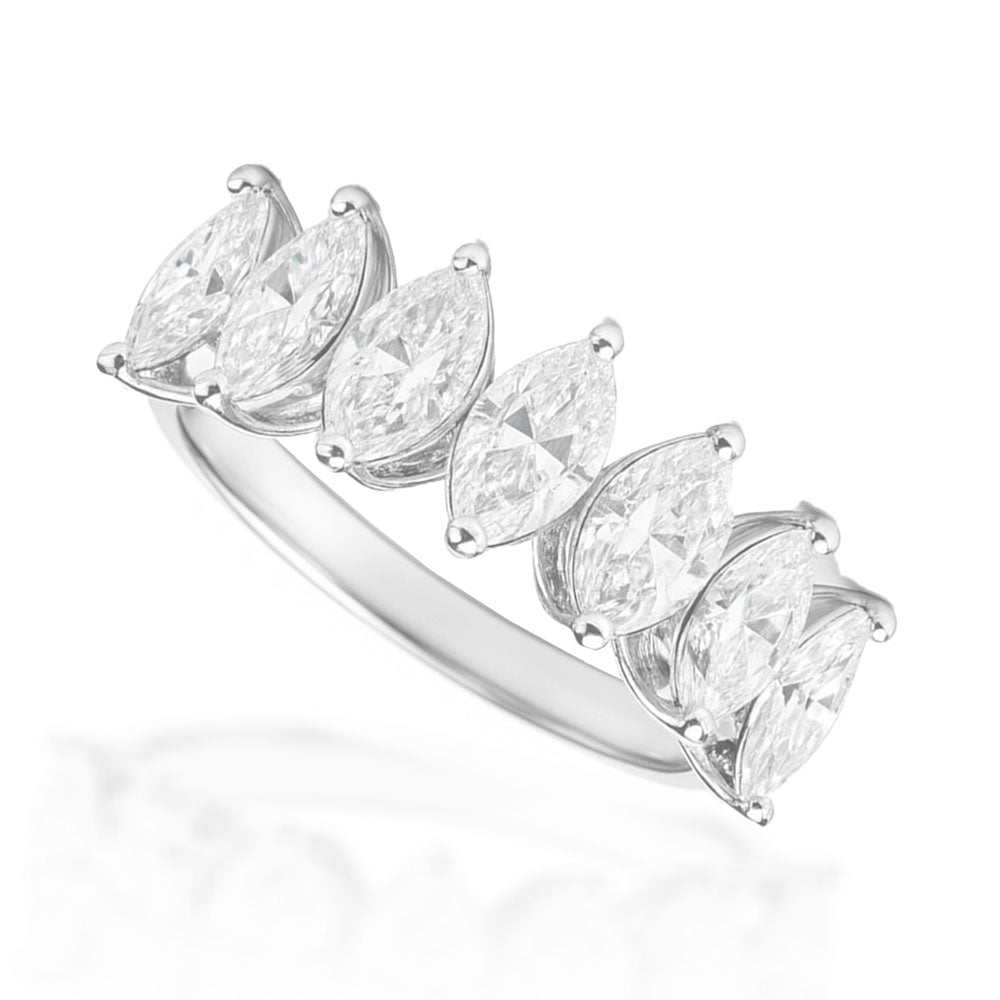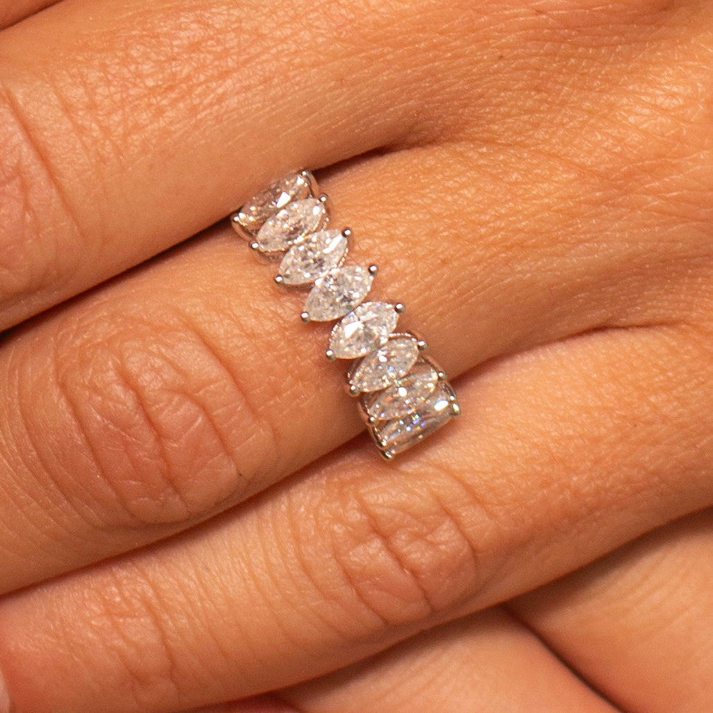 Uma meia aliança navete de 30 pontos em prata 925 com banho de ródio apresenta um design sofisticado e delicado. Cada pedra navete de 30 pontos (0,30 quilates) tem dimensões aproximadas de 7 x 3 mm.