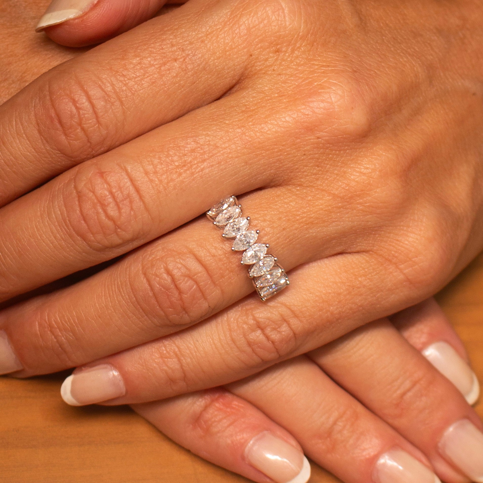 Se a meia aliança tiver, por exemplo, cinco pedras navete, isso resultaria em uma largura total de cerca de 15 mm, considerando a disposição das pedras. A banda em prata 925 geralmente varia entre 2 a 3 mm de largura, proporcionando um ajuste confortável e elegante.