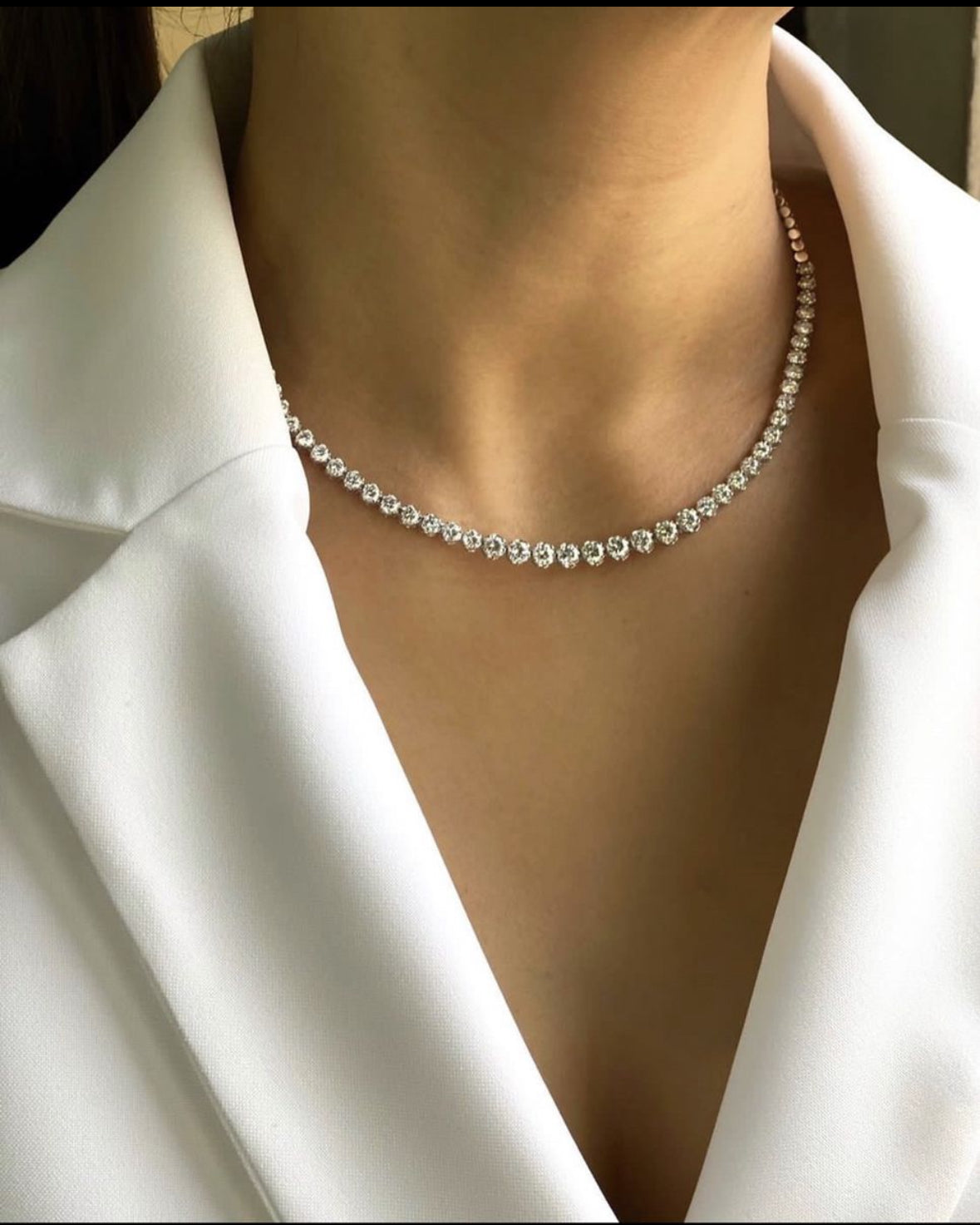 Deslumbre-se com a elegância e sofisticação deste colar de prata com moissanite! Com 40 cm de comprimento, essa rivière é adornada com pedras de moissanite de 30 pontos cada, que brilham com uma intensidade que rivaliza com os diamantes.